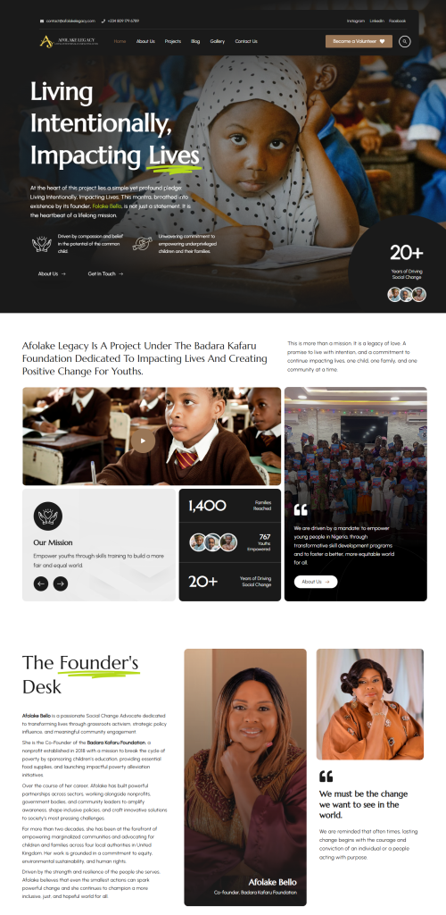 The Afolake Legacy Project is a registered non-profit under the Badara Kafaru Foundation founded by Madam Afolake Bello. The mandate of this project is to empower the Nigerian youth population with skills and training, equipping them to be stronger pillars of society and contributors to national economic growth. The project has partnered with other organizations in the past to fund multiple skill acquisition initiatives in Nigeria.